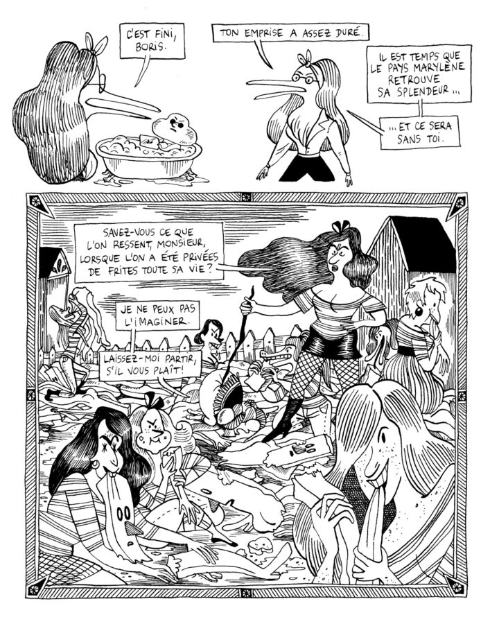Cinquième volume de la série “Les Contes du Marylène”, L’INSTITUT DES BENJAMINES est la suite directe de BORIS L’ENFANT PATATE. Le titre est inspiré du roman de Robert Walser L’Institut Benjamenta, où l’on suit Jacob von Gunter qui a quitté sa famille aisée pour entrer dans un pensionnat où l’on apprend qu’une chose : obéir sans discuter. Dans ce nouveau livre, Anne Simon met le personnage misandre Simone Michel au premier plan et raconte comment l’exercice du pouvoir peut pousser une femme révoltée à l’excès et à la déraison.